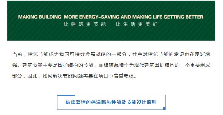 玻璃幕墻的節能,一方面是減少其使用面積,特別是東、西墻面的使用面積,這主要在建筑設計時確定。在建筑設計中,將需要采光、通風和設置玻璃幕墻的墻面安排在南、北面,盡量減少其朝東或朝西的面積;另一方面是遮陽。