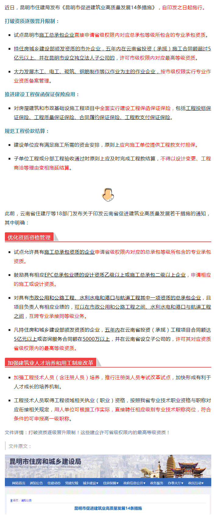 一、優化資質資格管理。對本市企業進一步簡化工程建設企業資質類別和等級設置,打破資質逐級晉升限制,試點昆明市施工總承包企業直接申請省級權限內對應總承包等級所包含的專業承包資質;持住房城鄉建設部頒發資質的市外企業,五年內在云南省投資(承攬)施工合同額超過 5 億元以上、并在昆明市設立獨立法人子公司的,許可市級權限內對應最高等級資質。推動勞務企業轉型升級,大力發展木工、電工、砌筑、鋼筋制作等以作業為主的作業企業,按市級權限實行專業作業資質備案管理。(市住房城鄉建設局牽頭,各縣(市)區人民政府、開發(度假)區管委會配合)