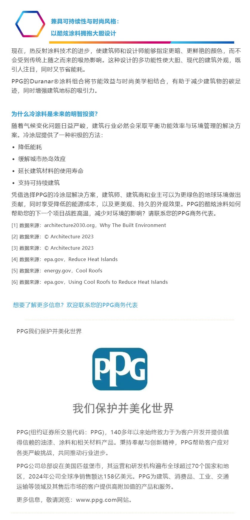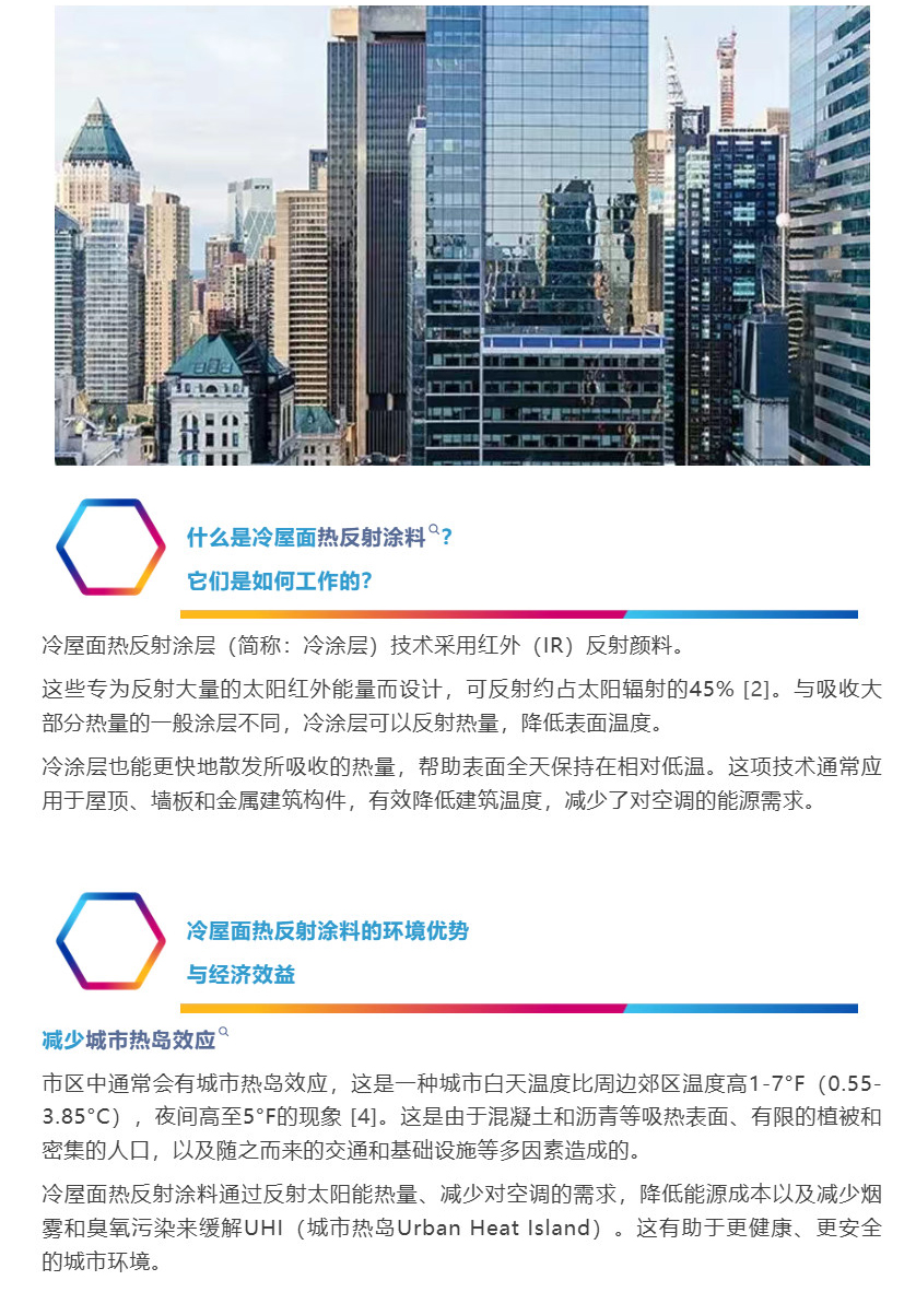 你知道嗎?據Architecture 2023© [1] 報道,因建筑物產生的溫室氣體占全球溫室氣體排放量的近50%,消耗了世界總能源的25%至40%。隨著城市化進程的加速和能源需求的指數級增長,建筑和施工行業(yè)迫切需要采用可持續(xù)的、節(jié)能的解決方案,以減少碳足跡和減緩氣候變化。在過去的幾十年里,冷涂層(熱反射)技術是非常有前景的解決這些挑戰(zhàn)的發(fā)展趨勢之一。